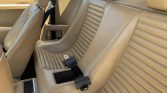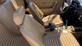 The four-place cabin features tan leather seats and door panels along with a contrasting black dashboard and carpets. Equipment includes power windows, a JVC cassette receiver, and a gated shifter. The right sun visor is broken and the air conditioning does not blow cold.