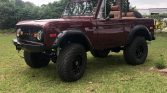 Work during the 2019 body-off refurbishment reportedly included stripping the old finish, replacing corroded panels with new sheet metal, application of bedliner on the inside of the tub, replacing the inner and outer front fenders, installing a body-color roll cage with sunshades, installing new weatherstripping and glass, and applying an epoxy primer before applying the dark red base coat and clear coat. Additional exterior features consist of black fender flares, an aftermarket front bumper with a Warn winch, a rear swing-away tire carrier, and aftermarket lighting.