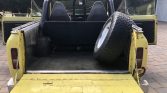 The exterior was refinished in yellow during prior ownership and features a removable white steel roof, protective side moldings, H4 headlights, a white bull bar with driving lights, a chrome front bumper and mirror caps, and diamond-plate rear bumper with a tow ball. The roof was refinished and new weatherstripping was installed in 2016. The windshield was replaced during current ownership, and part of the spare tire mount has been removed.