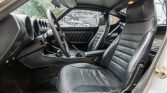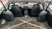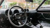 The cabin features seats upholstered in black vinyl along with a matching dashboard, center console, door panels, and carpets. Amenities include air conditioning, a Hitachi AM/FM stereo, a rear defroster, and an armrest. The headlight switch was replaced in December 2020. The clock does not work, a tear is visible on the driver’s seat, and the carpets show fading.