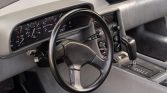 The Giugiaro-styled bodywork features brushed-stainless-steel panels and urethane front and rear fasciae mounted on a composite underbody and a Lotus-derived steel chassis. Features include gullwing doors, gray scotch-cal side stripes, a grooved hood, a front spoiler, and dual exhaust outlets. The rear window louver was repaired and a factory reinforcement bracket was fitted, and the headlights and hood and trunk struts were replaced in 2020. The seller states the car was ordered with a right-front fender-mounted antenna, but the system was replaced with an integrated interior component.