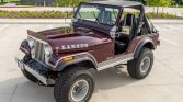 This 1981 Jeep CJ-5 was reportedly acquired by the seller from the original owner in 2009, and a subsequent refurbishment involved a repaint in dark red metallic, a reupholstered black interior, and the installation of a replacement 304ci V8 which is mated to a three-speed manual transmission and a dual-range transfer case. Equipment includes a Surrey top, removable doors, an aftermarket stereo, a lift kit, and 15″ alloy wheels with 33″ tires.