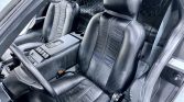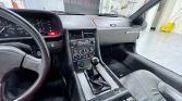 The cabin features black leather upholstery with a matching dashboard, center console, and door panels along with gray carpets. Equipment includes air conditioning, a cassette stereo, power windows, and DMC-branded floor mats. A rear console extension with cupholders was installed in 2021 along with a switch alignment plate, an LED climate control panel, dummy switches in the armrest panel, a replacement dead pedal, and replacement window, defrost, turn signal, and wiper switches. The carpets, door seals, passenger knee pad, left door pull-strap cover, and visor covers were reportedly replaced at DeLorean Motor Company of Huntington Beach, California under current ownership, and a seat stud and the left door escutcheon were repaired.