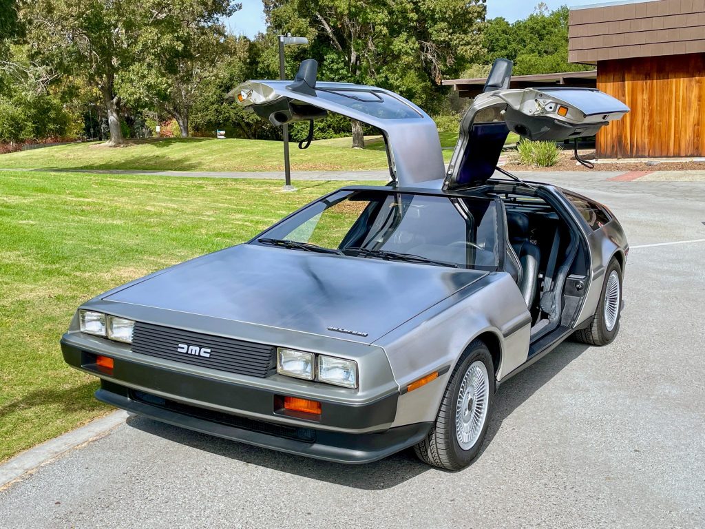 This 1983 DeLorean DMC-12 features brushed stainless-steel bodywork over black leather upholstery and is powered by a 2.85-liter V6 paired with a five-speed manual transaxle. Equipment includes gullwing doors, a louvered rear window cover, staggered-diameter alloy wheels, air conditioning, and a cassette stereo. Refurbishment work performed in 2021 is reported to have included refinishing the front fascia and rear louvers, replacing the door seals, repairing the wiring, reupholstering the instrument binnacle, and installing a KW coilover suspension kit and a GPS speedometer adapter.
