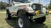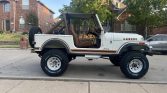 This 1983 Jeep CJ-7 Laredo is provided by a 4.2-liter inline-six linked with a four-speed manual transmission and a two-speed transfer case, and it is finished in Olympic White with a brown removable hardtop over Nutmeg vinyl. The truck rides on a lifted suspension and is further equipped with 15″ steel wheels, manually locking front hubs, auxiliary driving lights, side steps, and a tow ball as well as air conditioning, a roll bar, a locking center console, and an aftermarket head unit.