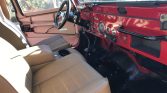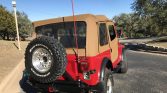 This 1985 Jeep CJ-7 is finished in red with a removable tan soft top and a matching interior, and power comes from a replacement 4.2-liter Jasper inline-six paired with a five-speed manual transmission and a dual-range transfer case. Modifications include Detroit Truetrac limited slip differentials, Howell fuel injection, a 2.5″ suspension lift, Warn bumpers, a front winch, aftermarket 15″ wheels, a CB radio, and a Panasonic stereo.