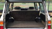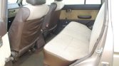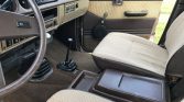 The cabin features seating surfaces trimmed in patterned beige cloth with a brown dashboard and matching replacement carpeting. Equipment includes air conditioning, hand-crank windows, a front center armrest with storage, and a Bluetooth-capable aftermarket stereo.