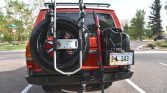The truck is finished in red with a roof that was re-painted to white under prior ownership. Exterior equipment includes a steel front bumper with a COMEUP winch, a BajaRack roof rack, Anzo USA LED headlights with rock guards, headlight washers, steel side steps, tinted windows, a Thule bike rack, a receiver hitch, and a steel rear bumper with a swing-out carrier housing a spare wheel and tire, two jerry cans, and a Handyman jack.