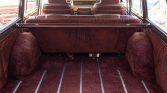 The cabin features power-adjustable front bucket seats trimmed in burgundy leather with cloth inserts along with a matching dashboard, rear bench, door panels, and carpeting. Amenities include air conditioning, cruise control, power accessories, and a cassette player.