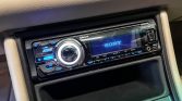 The seats are upholstered in light gray partial leather with a matching lower dashboard, center console, door panels, and carpets. Additional equipment includes automatic climate control, cruise control, power windows, mirrors, and locks, and a Sony AM/FM/CD head unit with Bluetooth capability. The original Blaupunkt head unit and equalizer are included with the car. The air conditioning system has been converted to R134a refrigerant and was recharged in October 2020.