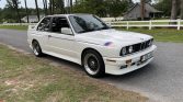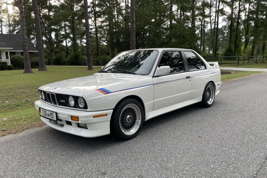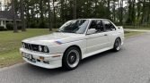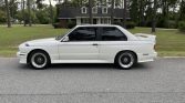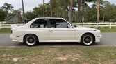 This 1989 BMW M3 is one of approximately 5,300 examples produced for the North American market between 1987 and 1990. Finished in Alpine White II over beige upholstery, the car is powered by a 2.3-liter S14 inline-four mated to a five-speed manual transmission and a limited-slip differential. Additional equipment includes tri-color bodyside stripes, 16″ BBS alloy wheels, a sunroof, a rear spoiler, fog lights, front sport seats, air conditioning, an onboard computer, a Racing Dynamics front strut tower…