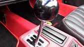 The interior features seats that have been reupholstered in black leather with red stitching along with a matching dashboard, door panels, and red carpeting. Amenities include air conditioning, power windows, Ferrari-branded floor mats, a gated shifter, and an Alpine stereo. The seller notes that the speakers have been removed and the air conditioning is inoperable.