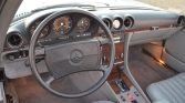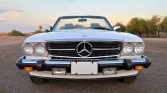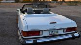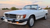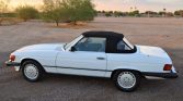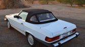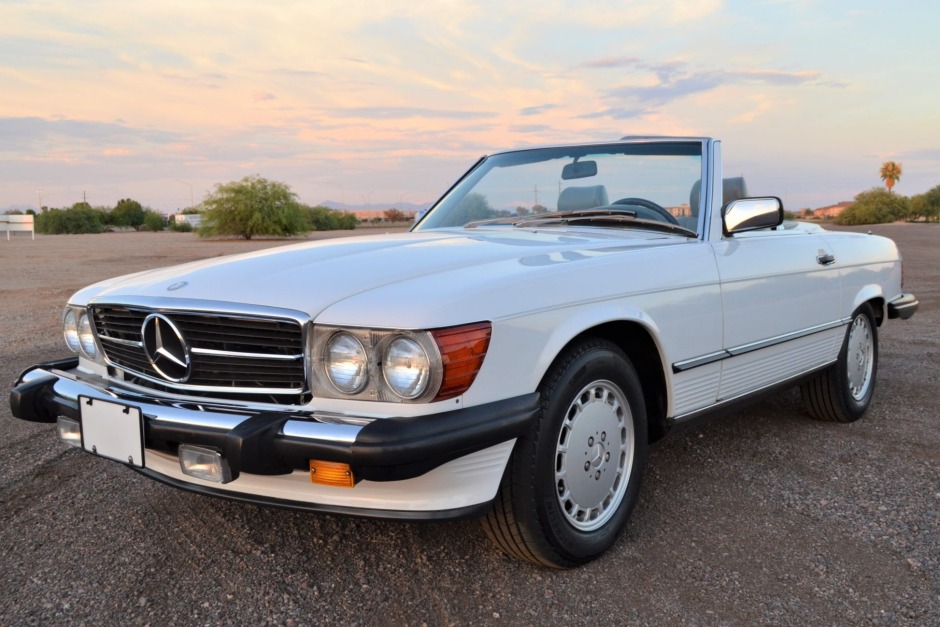 This 1989 Mercedes 560SL is powered by a 5.5-liter V8 paired with a four-speed automatic transmission, and it is finished in white over gray leather. Equipment includes a black soft top, a body-color hardtop, power accessories, alloy wheels, and a Becker Grand Prix stereo. The car was first sold at Enterprise Motorcars in Appleton, Wisconsin, and was registered in Illinois, Iowa, and then Arizona, where it was acquired by the current owner in 2021.