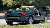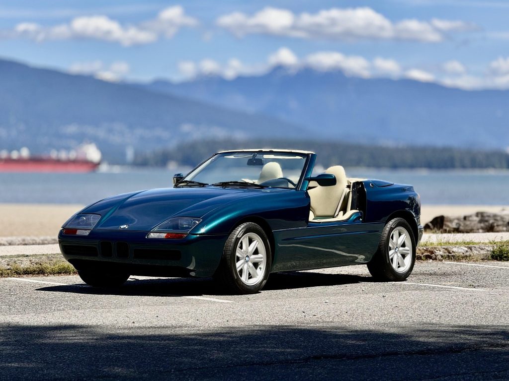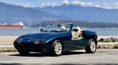 This 1990 BMW Z1 is finished in Ur-Green Metallic over beige and green upholstery and is powered by a 2.5-liter inline-six paired with a five-speed manual transmission. Equipment includes a black soft top, retractable doors, 16″ Style 11 alloy wheels, an Alpine audio system, and power windows.