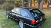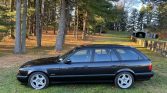 This 1992 BMW M5 Touring is one of just 891 produced worldwide and is finished in Diamond Black Metallic over M-Tech cloth. Power is supplied by a 3.8L S38B38 inline-six paired with a five-speed manual transmission and a limited-slip differential. Equipment includes an adaptive suspension, speed-sensitive power steering, dual-zone automatic climate control, a cassette stereo, power windows and mirrors, heated front seats, yellow-tinted high beams, fog lights, and 17″ Style 21 wheels.