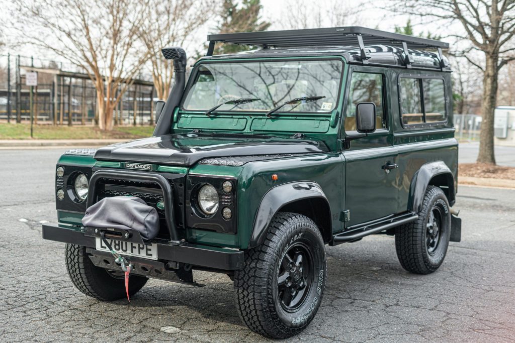 This 1995 Land Rover Defender 90 is a right-hand drive example that was imported in 2020 and acquired by the seller in March 2021, after which it underwent interior refurbishment at Rover Land of Dawsonville, Georgia. The truck is powered by a 2.5-liter 300Tdi inline-four mated to a five-speed manual transmission and a dual-range transfer case and was repainted in green with black trim over a tan vinyl upholstery. Features consist of a locking center differential, a snorkel, aluminum body panels, a sunroof, a winch, a brush grille, rock sliders, and a roof rack. Work conducted in June 2021 included a driveline fluid service, a vacuum flush of the brake system, a coolant system service, grease point lubrication, an oil leak repair, and an oil change.