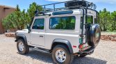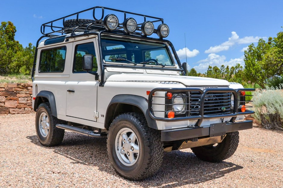 This 1995 Land Rover Defender 90 is one of approximately 500 North American-Specification station wagon examples imported into the US for the model year and is finished in Alpine White over Ash Gray Houndstooth cloth and vinyl. Equipment includes a roll cage, a roof rack, a front brush guard, a pop-up glass sunroof, auxiliary lights, 16″ five-spoke wheels, and tubular side steps along with air conditioning, an AM/FM/cassette stereo, and inward-facing rear jump seats. Power is provided by a 3.9-liter V8 linked with a five-speed manual transmission and a dual-range transfer case.