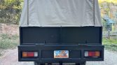 The cabin houses front bucket seats and a rear bench upholstered in gray vinyl that extends to the door panels. The seller notes that the truck has been fitted with air conditioning, an under-seat storage compartment, a Wolfbox rearview camera mirror, aftermarket speakers, and a touchscreen head unit with wireless smartphone connectivity.