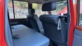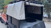 The high-roof body is finished in red with contrasting graphics and features a bed with a tan soft top and removable side panels. Other exterior features include an LED light bar, a Rhino-Rack roof rack, a hitch receiver, and fender-mounted mirrors.