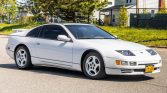 This 1996 Nissan 300ZX Twin Turbo is finished in Arctic White Pearl over tan leather and powered by a twin-turbocharged 3.0-liter V6 paired with a five-speed manual transmission. Equipment includes removable glass T-tops, tinted windows, 16″ alloy wheels, fog lights, power aLessories, cruise control, Super HICAS four-wheel steering, and an aftermarket sound system.