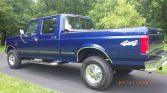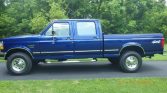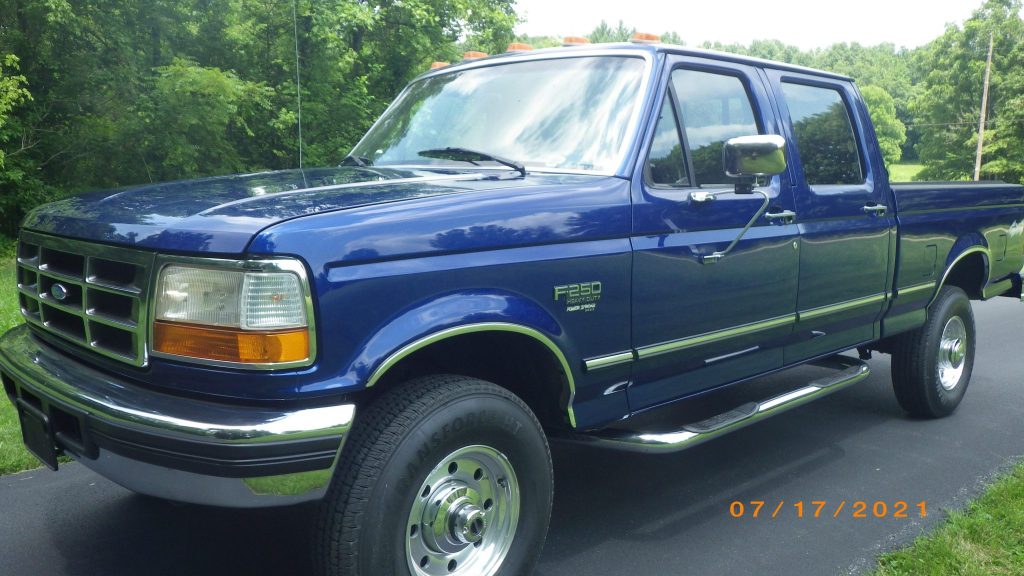 This 1997 Ford F-250 HD Crew Cab XLT is a short-bed 4×4 pickup that is finished in blue over gray cloth and powered by a 7.3-liter turbodiesel V8 paired with a four-speed automatic transmission and a dual-range transfer case. Additional equipment includes air conditioning, cruise control, an AM/FM/CD stereo, a spray on bed liner, a roll-up tonneau cover, a receiver hitch, tubular side steps, dual fuel tanks, locking front hubs, and 16″ aluminum wheels. The truck spent its life in Michigan and Indiana, and now has 146k miles.