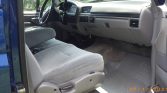The cab features front and rear bench seats upholstered in gray cloth. Amenities include a fold-down center armrest with a console for the front bench seat, air conditioning, cruise control, an AM/FM/CD stereo, and power windows and door locks.