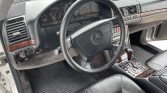 The cabin features seating trimmed in black Nappa leather with matching carpets, and burl wood veneers aLent the dashboard, center console, and door panels. Amenities include heated and power-adjustable front seats, an electric rear window shade, dual-zone automatic climate control, cruise control, and a Mercedes-Benz Exquisit cassette stereo.