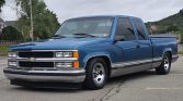 This 1998 Chevrolet C1500 Silverado is an Extended Cab pickup finished in Medium Blue Green and Light Pewter Metallic that has been fitted with a suspension lowering kit, window tint, and a tonneau cover. The truck is powered by a 4.3-liter Vortec V6 linked with a four-speed automatic transmission and a locking differential, and it is equipped with 15″ six-hole wheels, air conditioning, cruise control, a Bluetooth-capable Pioneer head unit, and two rows of bench seating trimmed in gray cloth.