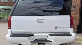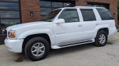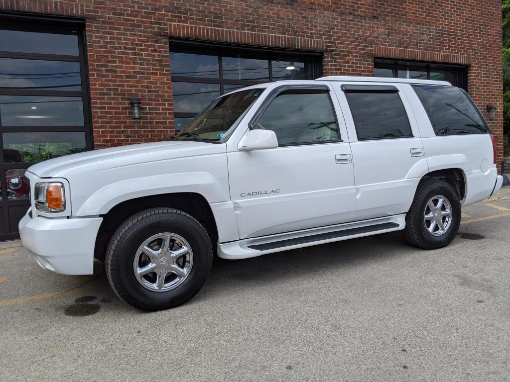 This 2000 Cadillac Escalade is finished in Aspen White over Neutral leather and is powered by a 5.7-liter V8 paired with a four-speed automatic transmission and a dual-range transfer case. Equipment includes heated seats, front and rear climate control, a Delco-Bose audio system, a video cassette player paired with a fold-down screen, headphone jacks, power aLessories, 16″ alloy wheels, tinted rear windows, fog lights, and roof rails. Recent service included rebuilding the alternator, recharging the air-conditioning system, and replacing the battery, drive belt, engine knock sensor, and an oxygen sensor as well as performing an oil change.