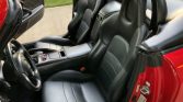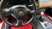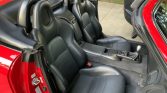 The cockpit features seats upholstered in black leather with perforated center inserts along with a matching dashboard, center console, top boot, door panels, and carpets. The car features a Honda security system, and additional amenities include air conditioning, cruise control, a wind deflector, and a factory AM/FM/CD stereo with a trunk-mounted disc changer. A set of gray floor mats and a separate set of red floor mats accompany the car.