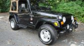 This 2000 Jeep Wrangler Sahara is finished in black over Dark Green and Camel cloth upholstery and is powered by a 4.0-liter inline-six linked with a three-speed automatic transmission and a dual-range Command-Trac transfer case. Features include a tan Quadratec soft top, full metal doors, 15″ Canyon aluminum wheels, a Rough Country steering stabilizer, fog lights, air conditioning, a fold-and-tumble rear seat, power steering, high-back front bucket seats, an AM/FM/CD stereo, and a roll bar.