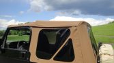 The cabin features high-back front bucket seats upholstered in Dark Green and Camel cloth with color-coordinated door panels and carpets. Amenities include a fold-and-tumble rear seat, a roll bar, a mini-floor console with a cup holder, air conditioning, an AM/FM/CD stereo, and a locking glovebox.