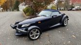 This 2001 Chrysler Prowler Mulholland Edition is finished in Prowler Midnight Blue with light blue pinstriping and a color-coordinated soft top, and it is powered by a 3.5-liter V6 paired with a four-speed automatic transaxle. Equipment includes staggered-diameter chrome-finished alloy wheels, air conditioning, cruise control, and an audio system with a six-disc CD changer and a cassette player.