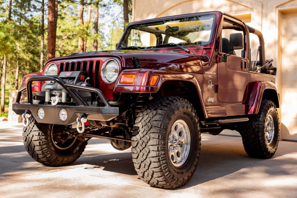 This 2001 Jeep Wrangler Sahara is finished in Sienna Pearl over Camel and Dark Green cloth and is powered by a 4.0-liter inline-six paired with a five-speed manual transmission and a dual-range transfer case. Equipment includes a tan soft top, 15″ American Racing wheels, 33″ Goodyear tires, a suspension lift kit, aftermarket bumpers, and a Warn Winch.