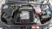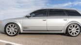This 2002 Audi S6 Avant is powered by a 4.2-liter V8 mated to a five-speed Tiptronic automatic transmission and Quattro all-wheel drive, and it is finished in silver over gray leather and Alcantara upholstery. Equipment includes 18″ RS6 wheels, H&R coilovers, a sunroof, dual-zone automatic climate control, a factory CD/cassette stereo, and heated seats. Service performed since 2020 is said to have involved replacement of the timing belt, water pump, fuel pump, and fuel filter.