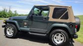 The truck is finished in Shale Green Metallic with Sahara graphics and features a replacement beige soft top that was reportedly installed in preparation for the sale. Additional equipment includes a black vinyl spare tire cover, a receiver hitch, full-frame metal doors, body-colored fender flares, side steps, tow hooks, and driving lights.