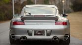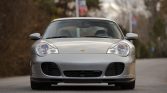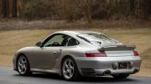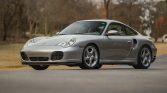 This 2002 Porsche 911 Turbo coupe is powered by a twin-turbocharged 3.6L flat-six that drives all four wheels via a six-speed manual gearbox, and it is finished in Arctic Silver Metallic over Graphite Gray full leather. Equipment includes 18″ Turbo Twist wheels, a speed-activated rear spoiler, bi-xenon headlights, automatic climate control, cruise control, a Porsche CDR-220 stereo, red seatbelts, and aluminum cabin accents.