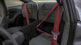 The power-adjustable front seats have embossed Porsche crests and are upholstered in Graphite Gray supple leather, while matching leather extends to the dashboard and door panels. Features include driver-seat memory settings, automatic climate control, cruise control, a Porsche CDR-220 stereo, red seatbelts, and metal accents on the door sills, shifter, and handbrake lever.