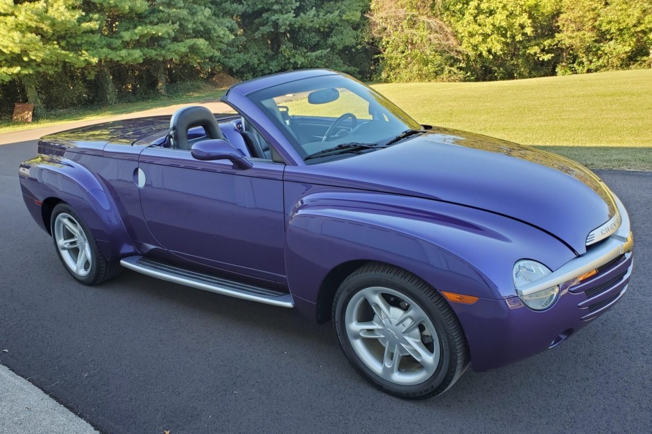 This 2004 Chevrolet Super Sport Roadster (SSR) is finished in purple over black leather and powered by a 5.3-liter Vortec V8 paired with a four-speed automatic transmission and a Torsen limited-slip differential. Equipment includes a power-retractable hardtop, a Bose premium sound system, heated and power-adjustable seats, and a wood-trimmed rear cargo compartment as well as a receiver hitch, integrated running boards, dual exhaust outlets, and staggered-diameter wheels.