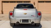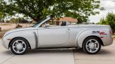 The SSR’s body sits on a modified GMT360 platform shared with the contemporary TrailBlazer, and styling was inspired by Chevrolet’s post-war Advance Design trucks. This example is finished in silver and features rear-fender SSR decals, a dual exhaust system with polished finishers, heated side mirrors, fog lights, and a body-color retractable hardtop that folds into a compartment between the cab and the truck bed. Paint chips on forward-facing surfaces are noted.