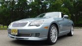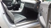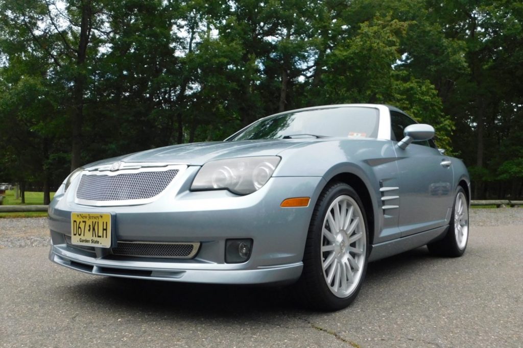 This 2005 Chrysler Crossfire coupe is one of approximately 2,500 SRT-6 examples produced, and it is finished in Sapphire Silver Blue Metallic over Dark Slate Grey upholstery. Power is supplied by a supercharged 3.2-liter V6 paired with a five-speed automatic transmission, and additional equipment includes staggered-diameter wheels, front and rear spoilers, power-adjustable and heated seats, air conditioning, and an Infinity CD stereo.
