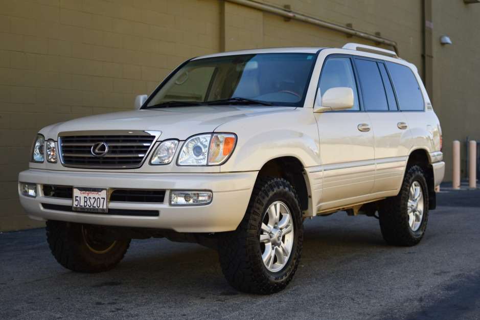 This 2005 Lexus LX470 is finished in Sand Dollar Pearl over Ivory leather and is powered by a 4.7-liter V8 paired with a five-speed automatic transmission, a dual-range transfer case, and a locking center differential. Equipment includes 18″ alloy wheels, a modified suspension with a 2.5″ lift, a Land Shark Outfitters drawer system in the rear cargo area, and power-adjustable and heated front seats.