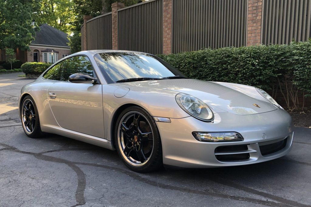 This 2005 Porsche 911 Carrera coupe was purchased new by the seller from Blue Glass Porsche in Louisville, Kentucky. The car is finished in Arctic Silver Metallic over a black leather interior and is powered by a 3.6-liter flat-six paired with a six-speed manual transaxle. Equipment includes 19″ Carrera S wheels, Bilstein PSS9 coilovers, GT3 sway bars, bi-xenon headlights, a sport exhaust system, heated power-adjustable seats, the Sport Chrono Package, and Bose audio. A pre-purchase inspection and DME report were carried out in anticipation of the sale along with an oil change and replacement of the coil packs and spark plugs.