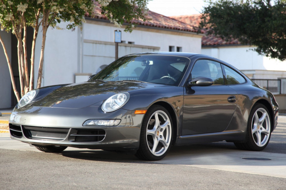 This 2005 Porsche 911 Carrera coupe is finished in Slate Grey Metallic over black leather and is powered by a 3.6-liter flat-six paired with a six-speed manual transaxle. Equipment includes 19″ Carrera Classic wheels, bi-xenon headlamps, power-adjustable adaptive sports seats, the Sport Chrono Package Plus, automatic climate control, and the Bose High-End Sound Package. The car has been registered in California since new and was acquired by the seller in 2019. Recent service consisted of replacing the clutch and flywheel, along with performing a brake fluid flush and an oil change.