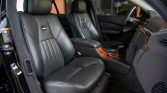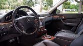 The cabin is upholstered in Exclusive Graphite AMG leather, which extends to the center console, dashboard, and door panels. Amenities include heated and ventilated dynamic front seats with position memory, heated rear seats, four-zone automatic climate control, Keyless Go, cruise control, rear window shades, COMAND infotainment with navigation, and Bose audio with a CD changer.