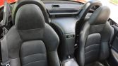 The cabin features bolstered bucket seats trimmed in black leather with a matching dashboard, door panels, and carpets. Amenities include push-button start, a leather-wrapped aluminum shift knob, cruise control, keyless entry, air conditioning, factory CD stereo, and power accessories.
