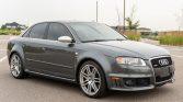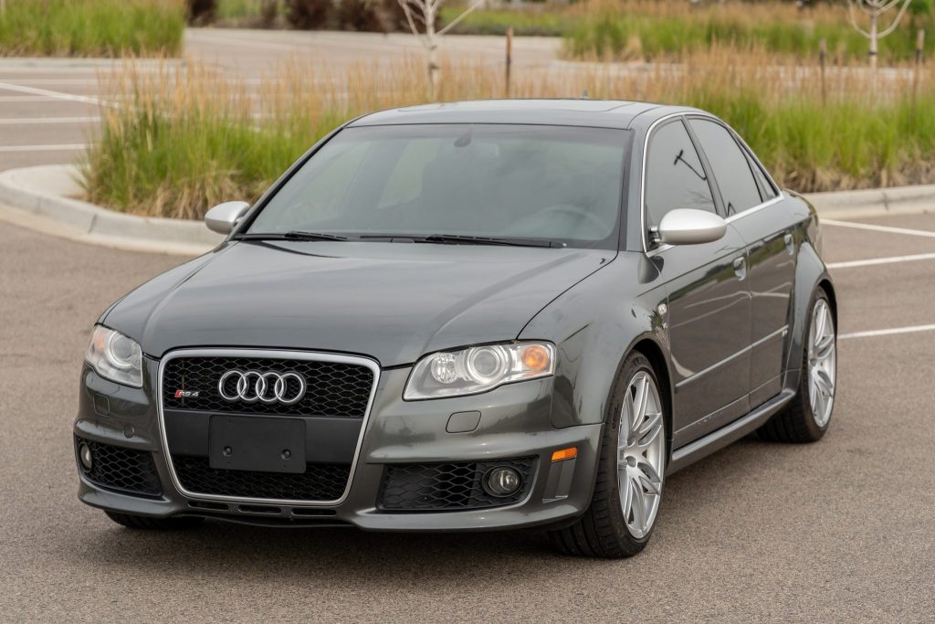 This 2008 Audi RS4 is finished in Daytona Gray over black leather and powered by a 4.2-liter V8 paired with a six-speed manual transmission and a Quattro all-wheel-drive system. Additional equipment includes a sunroof, 19″ wheels, heated seats, dual-zone automatic climate control, brushed aluminum interior trim, navigation, rear sunshades, and a Bose sound system. The car was sold new by Ed Carroll Audi of Fort Collins, Colorado, and was acquired by the seller in early 2020.