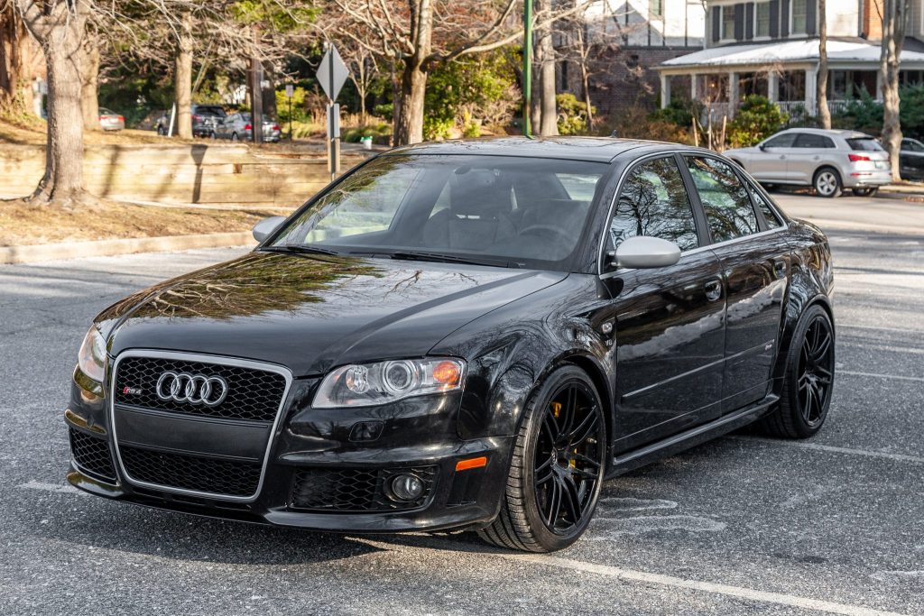 This 2008 Audi RS4 is finished in black over matching leather and is powered by a 4.2-liter V8 mated to a six-speed manual transaxle and a Quattro all-wheel drive system. Equipment includes a power glass sunroof, power-adjustable and heated Recaro front seats, heated rear seats, navigation, a Bose audio system, and 19″ wheels. Service under current ownership has included replacement of the clutch, flywheel, spark plugs, front brake pads and rotors, and tires.