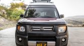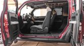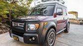 This 2008 Honda Element LX 4WD is finished in burgundy over gray cloth and equipped with a pop-up camper top, aftermarket dual–beam xenon headlights, a roof rack and basket, a ladder, a digital rear-view mirror, and a Kenwood touchscreen head unit with a back-up camera display. Additional features include 17″ Raceline wheels, air conditioning, reverse-hinged doors, a removable glass roof panel, tinted windows, sound deadening material, and a receiver hitch. Power is provided by a 2.4-liter inline-four paired with a five-speed automatic transaxle and a RealTime 4WD system.