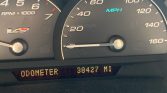 A leather-wrapped and heated steering wheel frames a 160-mph speedometer, a tachometer with a 6,500-rpm redline, and auxiliary gauges. The digital odometer shows 38k miles.